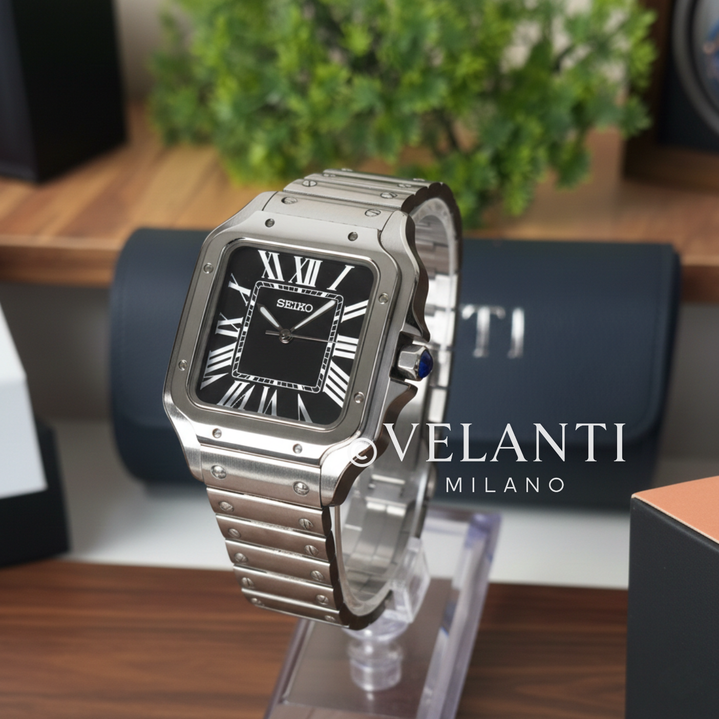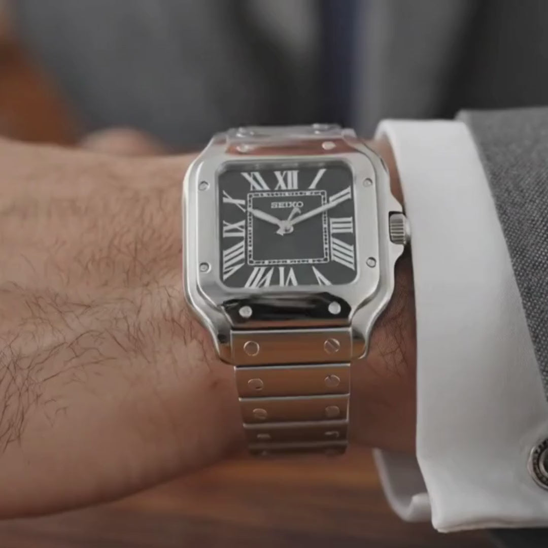 Inspired by the iconic Santos design, and featuring the prestigious Seiko NH35 automatic movement, we present the Seiko Mod Santos. A 38 mm high-end quality watch combining the perfect alliance between excellence and accessibility.