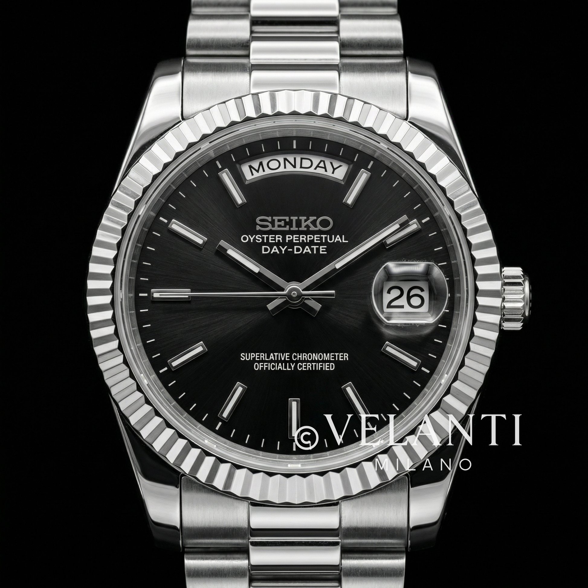 Inspired by the iconic Daydate design, and featuring the prestigious Miyota 8285 automatic movement, we present the Seiko Mod Daydate. A 39 mm high-end quality watch combining the perfect alliance between excellence and accessibility.